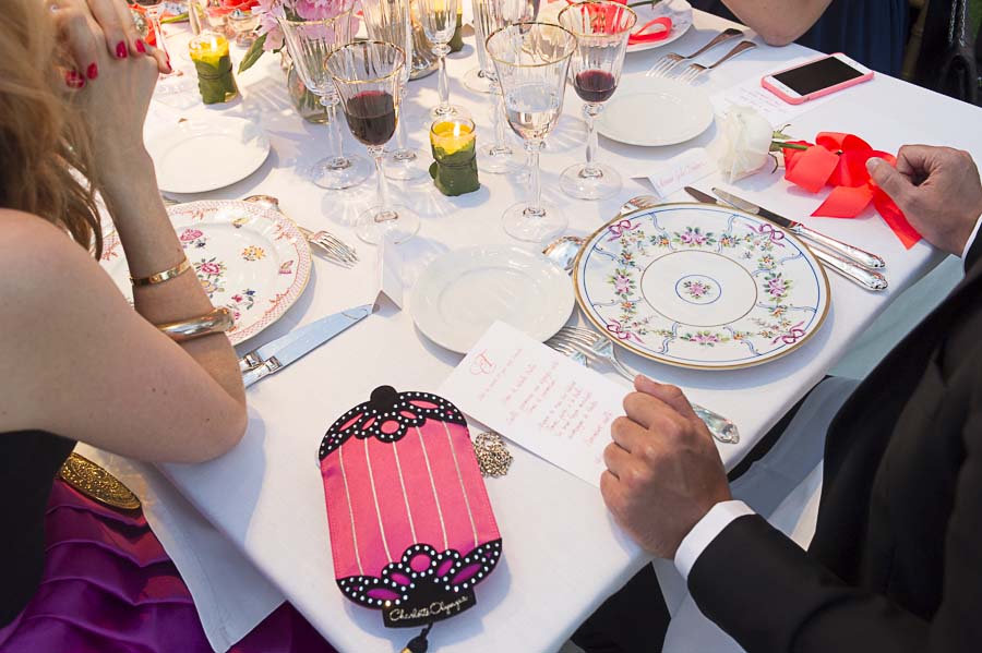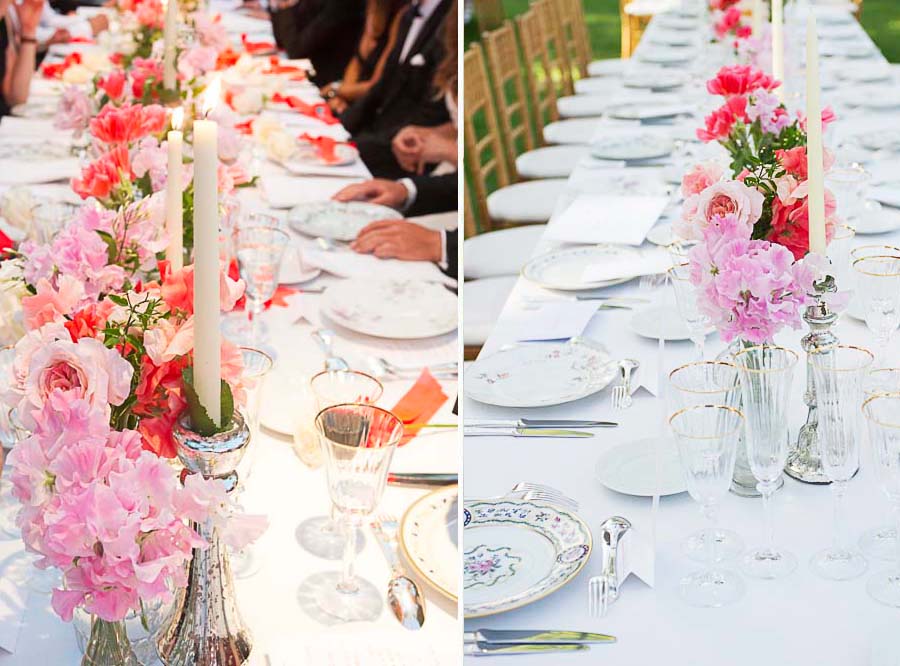 As for the tableware, vintage pink floral plates were used with silver flatware and crystal glasses trimmed in gold to finalize the presentation.