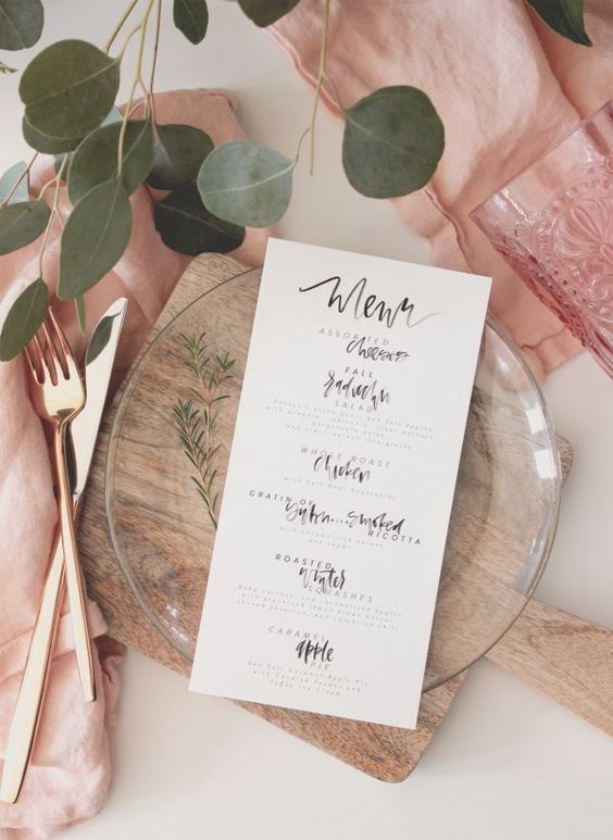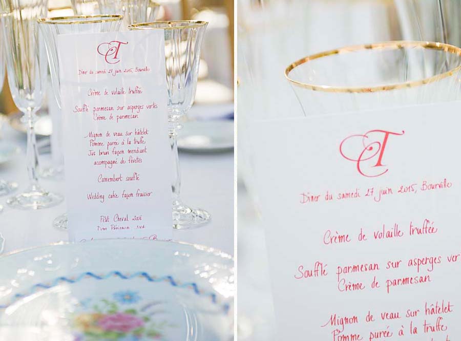 Menus with created with the bride and groom’s initials monogrammed at the top and finished with a bold pink hand-written font for a simple, yet elegant look.