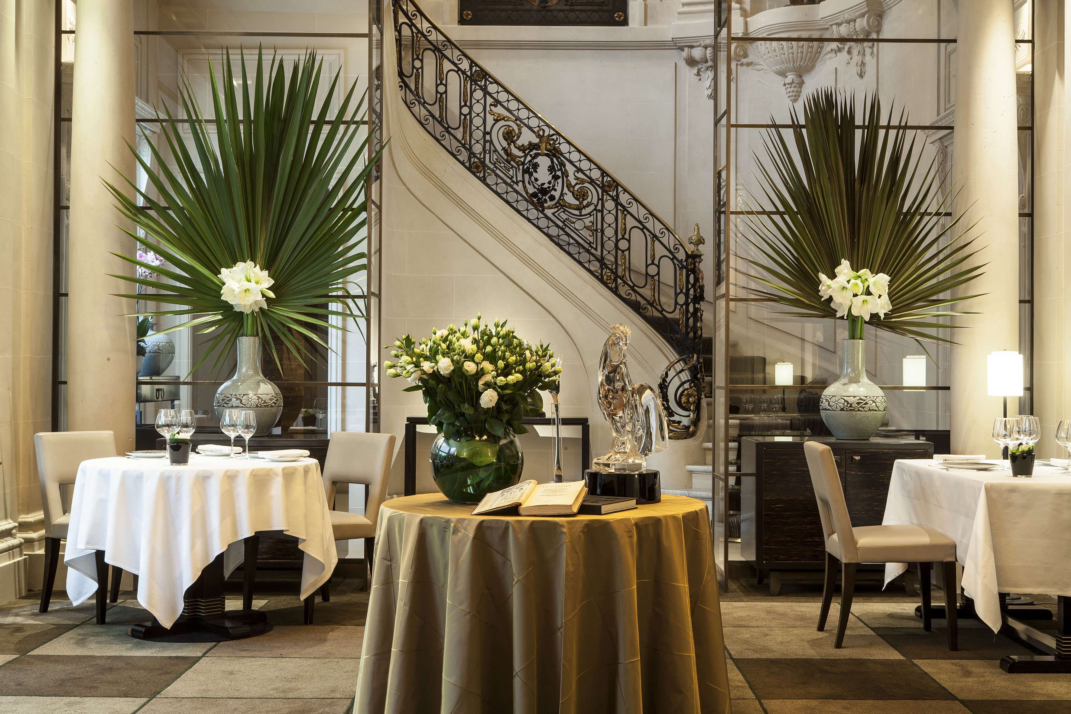 Far from the muted colours and monochrome theme of many of Paris’ finest establishments, Michelin Star Restaurant 114 Faubourg is sure to bring a splash of colour to your Wedding Dinner. Set on two levels, with floral wall panelling and intricate, black and gold-leafed railing, the setting is vibrant and ornate. The bustling and ambiance-enhancing open-plan kitchen sees Chef Jean-Charles Cauquil and his talented team creating their sophisticated but classic dishes right before your eyes. Despite being situated inside the famous Hotel Bristol, the clientele are mainly loyal, local Parisians so tables are kept to smaller numbers, welcoming from 8-10 wedding guests with menus starting €160p/h including drinks.