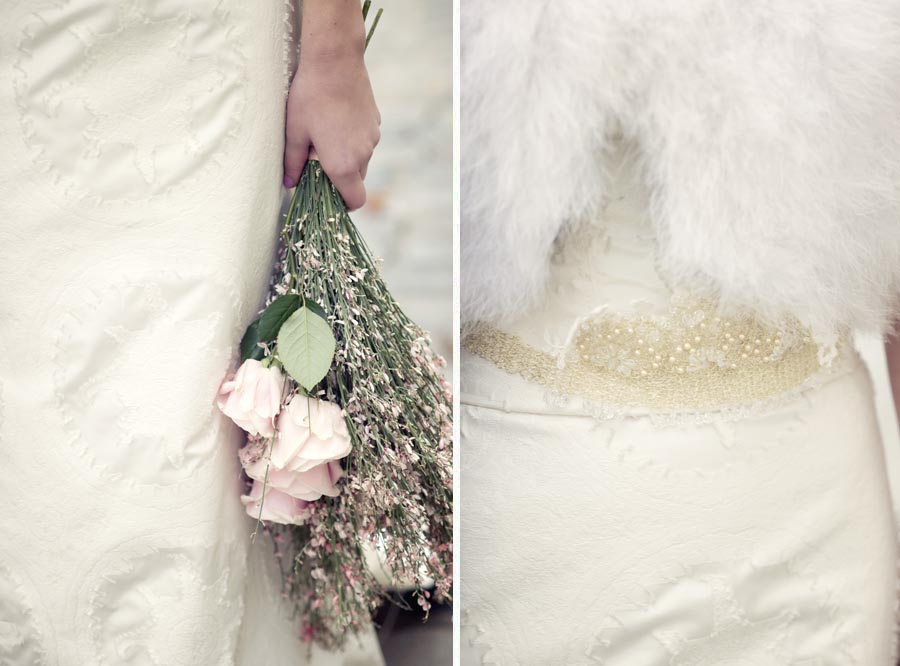 We teamed up with Axelle of Ma Bonne Amie for Hana’s complete wedding day ensemble. She runs a wonderful business that lends couture and luxury brand evening gowns and cocktail dresses for special occasions. This summer, she recently added wedding gowns to her already exquisite collection. Axelle has a fabulous selection of wedding gowns and the pieces vary depending on the style you are wanting. We ultimately fell head over heels for an exquisite Monique Lhullier gown. It fit Hana perfectly and we felt it really tied into the romance of the day we were trying to create. Since her showroom is basically any fashionista’s dream, it was easy to find other pieces to finish the rest of Hana’s look. Edith of “Une Fleur en Liberte” provided Hana with delicate long-stemmed powder pink roses that were hand-tied with ribbon to match. We wanted to keep things uncomplicated, but, of course, beautiful, and her bouquet showed just that!