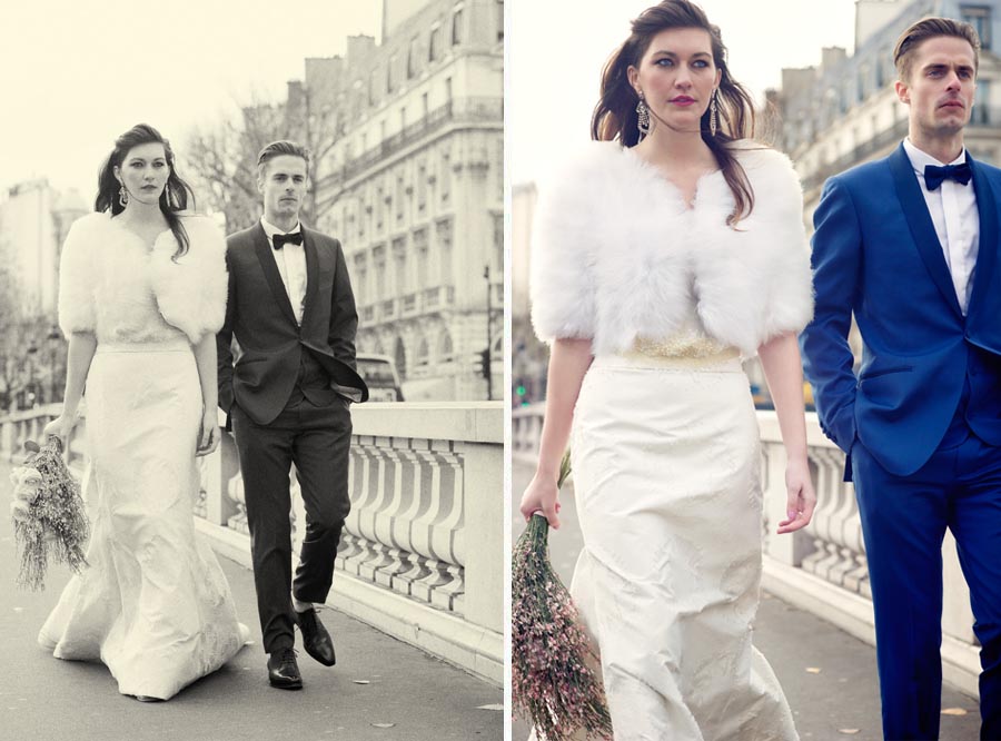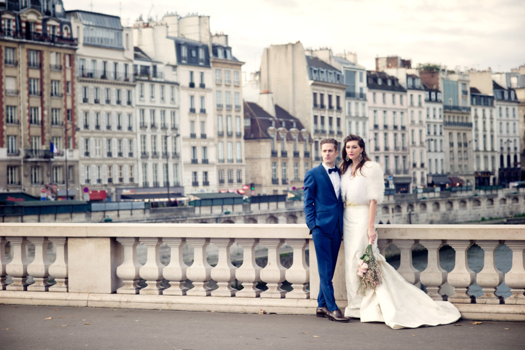 Planning: WeddingLight Events | Photography: Olivier Lalin of WeddingLight Paris | Models: Hana & Mathieu | Monique Lhuillier gown, Paule KA leather jacket and Helene Zubelidia earrings via Ma Bonne Amie | Custom Suit: Faubourg Saint Sulpice | Hair and Makeup: JMS by James | Flowers: Une Fleur en Liberte | Picnic: Picnic in Paris | Picnic Location: Ile Saint Louis | Wedding Bands & Necklace: Didier Guillemain Paris | Antique Ring: Anne Defromont | White Bolero & Pancho: Max Chaoul Couture | Hotel: Providence Hotel
