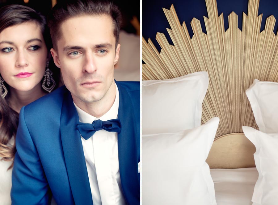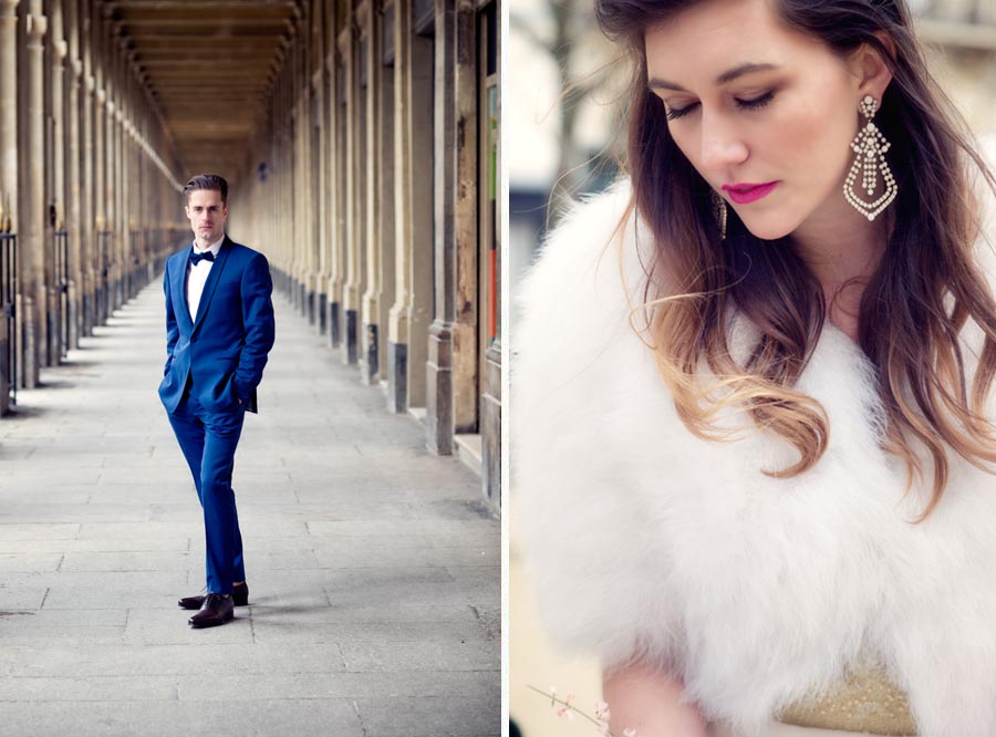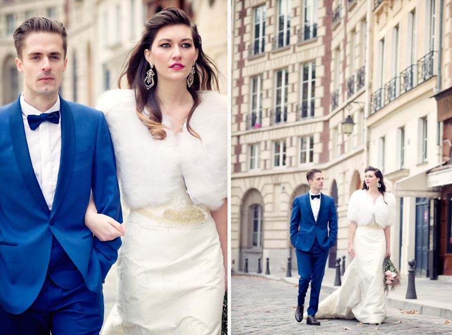 As for Mathieu, our male model, we were lucky enough to have the creative talents of “Faubourg Saint Sulpice” to take on his wedding day attire. We loved that they offer one-of-kind custom suits that provide men with very dapper and dashing looks that you do not see all the time. Working with Arthur and his stylist, Joséphine, was a dream, too. They provided us with a few choices and we opted for a rich navy blue number that included a tailored jacket, matching tie, slim cut pinstripe trousers and caramel-coloured shoes.
