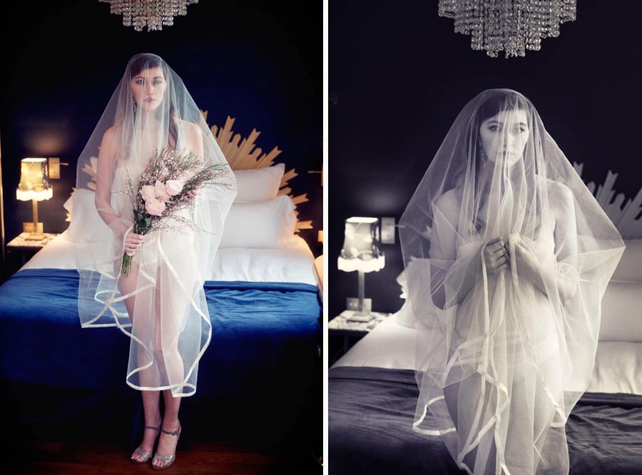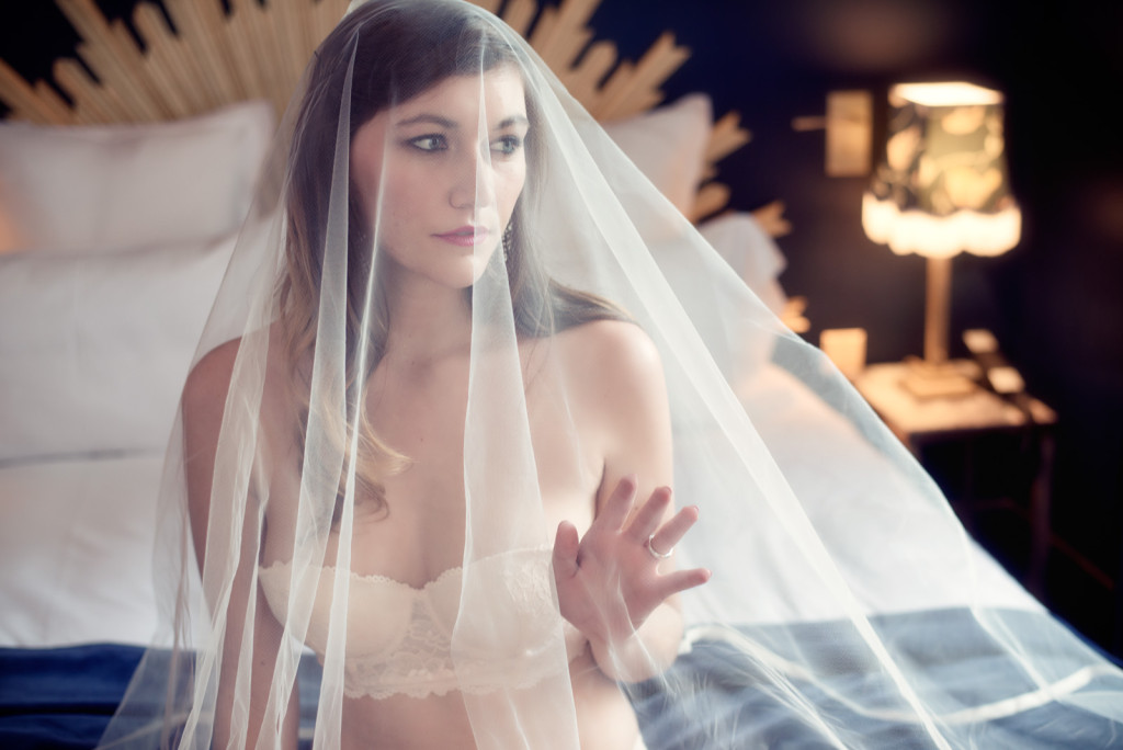 To finish the shoot, Olivier fell in love with a very stylish hotel in the 9th called Hotel Providence. Their chic rooms provided a splendid background for the intimate boudoir scenes. Dressed in a custom designed Max Chaoul piece with a lovely feathered bolero to match, Haha finished the shoot with a few beautiful sensual shots. It was truly wonderful to work with such a dedicated group of people who love what they do and we hope you do, too!