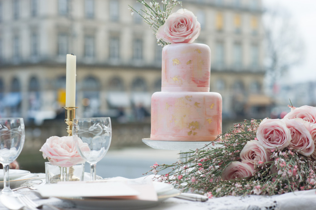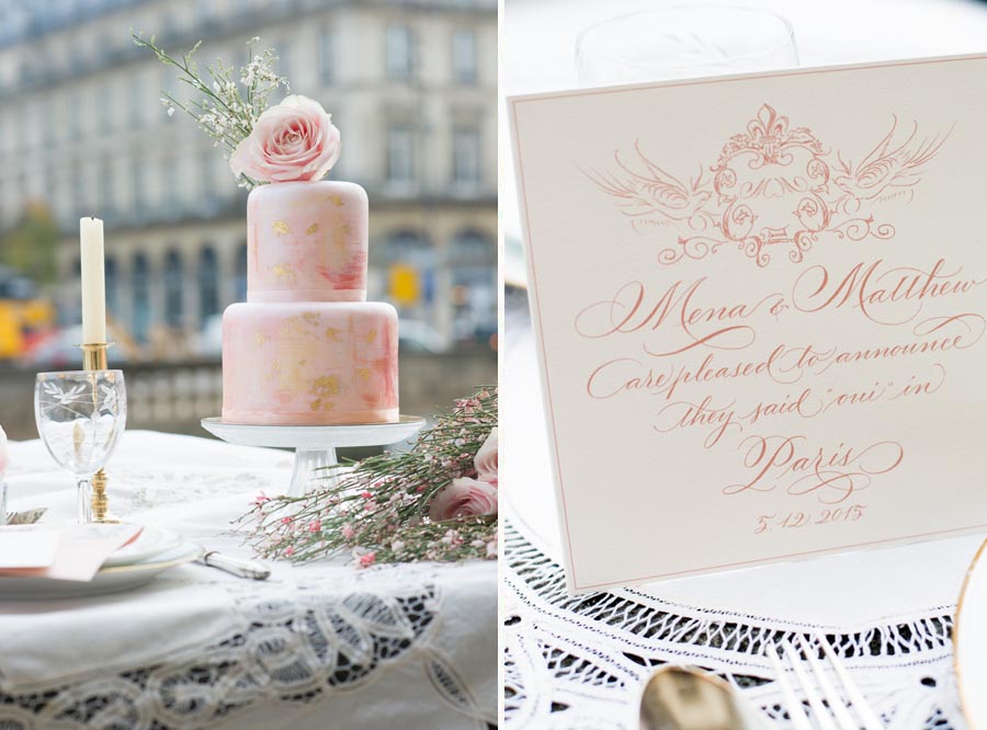 The day began with hair and makeup by the very talented, James of JMS by James. Romain from “Anciennes de Prestige picked up our couple in a classic DS convertible citroen which made my day! “Leanne’s wedding gown is designed by the very talented Carolina Herrera and lent to us via “Ma Bonne Amie” in Paris. Frederic was wearing a very slick tuxedo from “Faubourg Saint Sulpice” that we love here at WeddingLight Events. Synie from “Synies” in Paris designed an ever so tasty tiered pink and golden painted wedding cake; simply Yummy! Edith from “une fleur en liberté” made a lovely delicate long-stemmed powder pink roses and spring purple broom. I invite all of you to go to our Paris wedding photographers website to enjoy a larger selection of this gorgeous elopement style documentary shot in Paris. It was a lot of fun to produce and we are already looking forward to our next adventure.