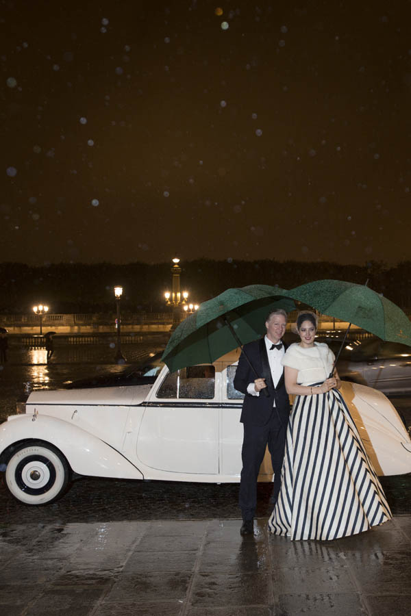 Unfortunately, it rained on the evening of their ceremony. But that did not pose a problems for the happy group. Equipped with giant green umbrellas, they made their way across town to the Louvre where they had their ceremony under the museum’s gorgeous walkways. Afterwards, Jamie and Scott took an evening photo tour through city in their classy Rolls Royce vintage car with our favorite Paris wedding photographer. They were all a great bunch of people and we love working with clients from around the world making sure their special day comes true!
