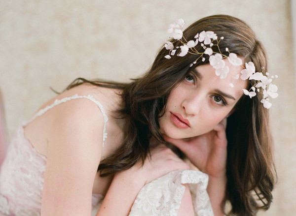 It started with a simple idea of doing something with a vintage chic theme, which was realized with the addition of our friend, Max Chaoul‘s stunning vintage inspired gowns. The Daisy gown is a 1920’s inspired look in a fluid low waisted satin design and a gorgeous embroidered lace top. The second is the Lana gown, which is a 1940’s inspired look in a empire cut with a romantic long sleeved crochet design. We then paired ethereal veils and romantic headpieces from Rhapsodie Paris, lovely artisanal (and ethically made) jewelry by Paulette à Bicyclette (yes, you’ve seen her on our blog before!) and whimsical florals by Edith of Une Fleur en Liberte in white and pastel peach and pink colors. To complete our models looks hairstylist, Lucie Letz and Los Angeles makeup artist, Melody Kennedy opted for one model with a bold look that included a daring pink lip and smoky eyes and the other model with a charming and natural look and playful curls. For the location we wanted to have a “Secret Garden” feel with all of its serenity and romance. We were delighted when a friend of our photographer allowed us to use his dreamy home, which is just location outside of Paris in the Parisian countryside. Everyone’s contribution was important, but without the amazing talent of our wonderful photographer, Olivier Lalin of WeddingLight Photography, this shoot would not have happened.