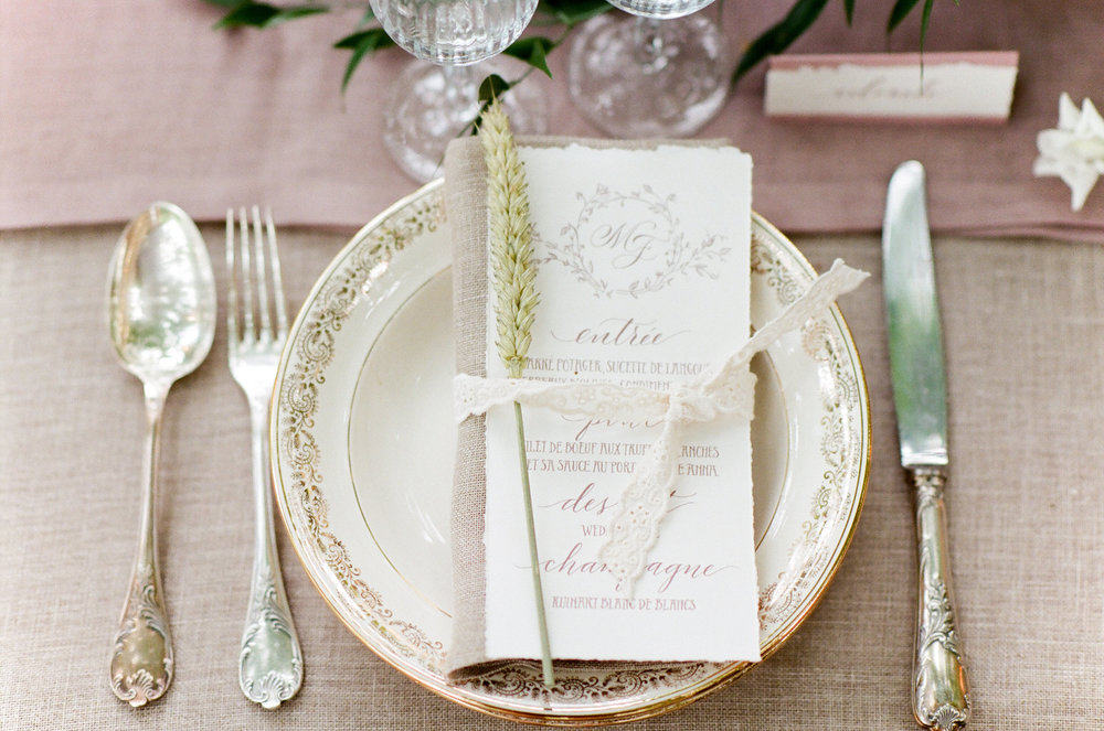 – There are definitely ways around this. Something as simple as pretty place cards for an intimate wedding of just close friends and family doesn’t cost a lot, but is much appreciated by guests and adds a distinct touch. Wedding signage can be something as simple as a “Merci !” sign, or as elaborate as a hand-painted, gold-leafed welcome sign that takes an entire day to paint and calligraph. What the planner, the couple, and I come up with is always based on the client’s vision and budget.