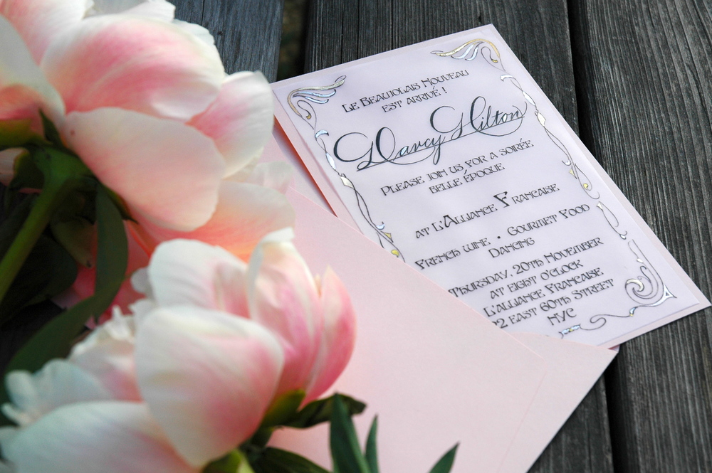 – Not always, but that’s where I come in. The messy-braid bride, even if she hasn’t yet thought about what calligraphy style will suit, usually prefers simplistic, imperfect, organic letterforms that communicate warmth and spontaneity. Hand-made papers, watercolor tones, and whimsy. The chic Parisian bride will more often be drawn to very luxurious stationery, engraved or Letterpress, and elegant Ornamental Penmanship script styles. So, there really are types and styles of calligraphy to suit different occasions. A messy organic script looks too informal and out of place in a Belle Époque palace ballroom, just as a gold-embossed and crested invitation suite does not suit a simple country wedding.