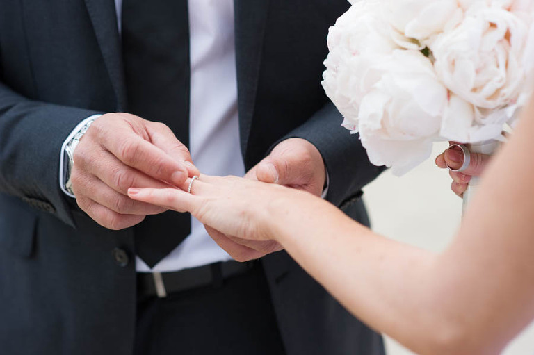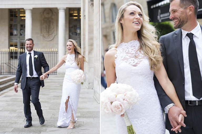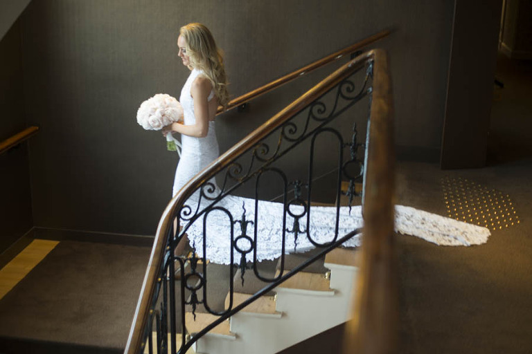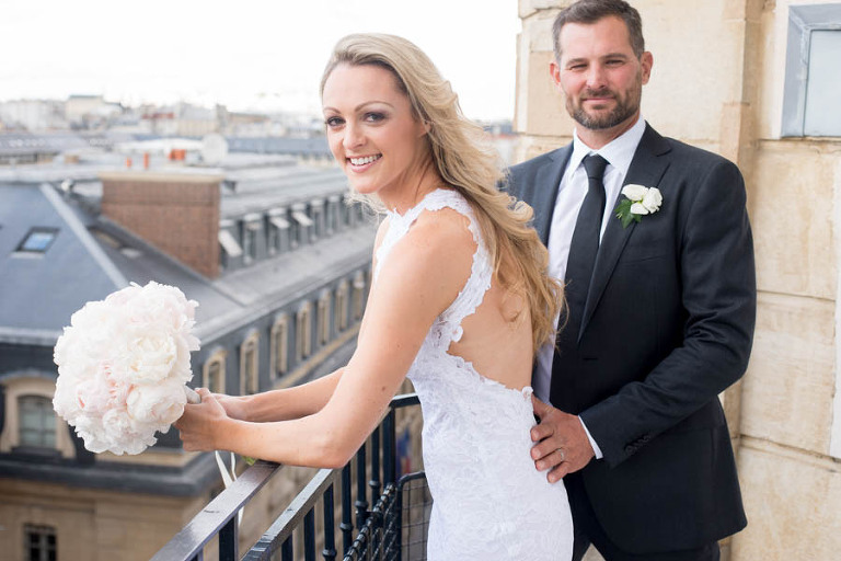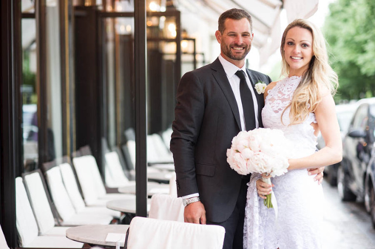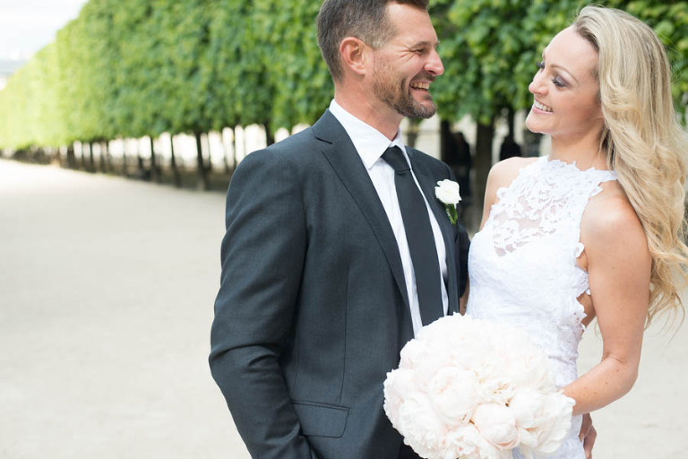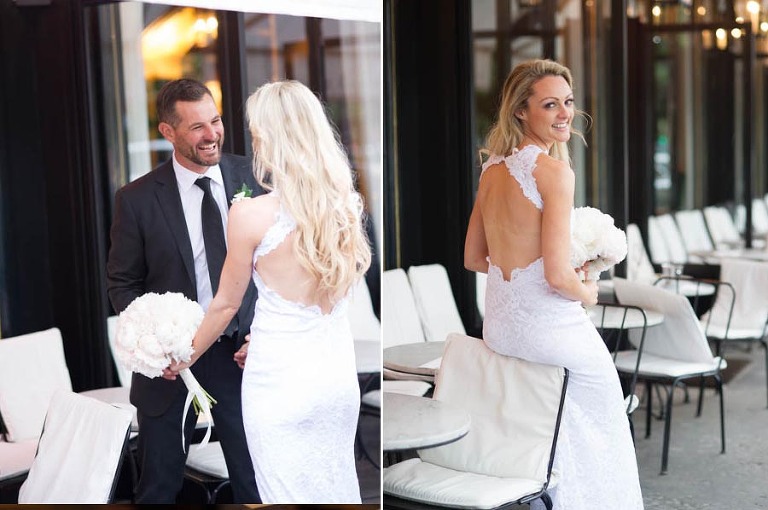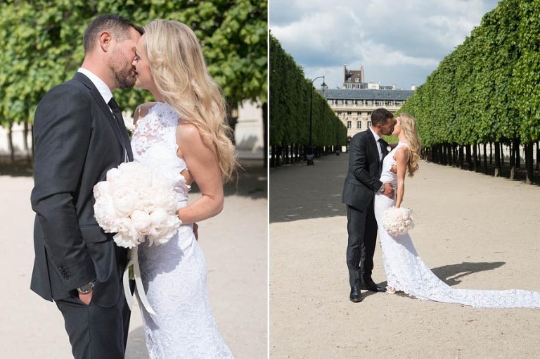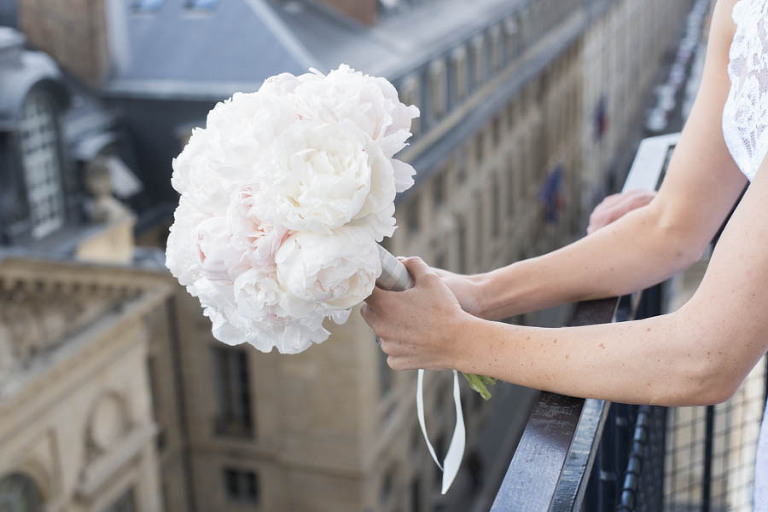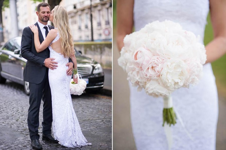 The weather on the day of the elopement was authentically Parisian, meaning light rain and bursts of sunshine. I arrived in the afternoon at the Grand Hotel du Palais Royal to meet the charming young couple. The beautiful bouquet and boutonniere made of peonies had already arrived, delivered and arranged by Estelle Preston’s flower services. Elyse was in her private room getting ready and being pampered by the incredible makeup and hair team, Fred and Muriel. Elyse looked picture perfect with her loose blonde waves and subtle make-up. Trent returned to the room and was taken aback by his beautiful bride and they toasted with champagne. The hair and makeup team and I left the room to give the couple some privacy and so that Elyse could slip into her stunning sleeveless lace gown by designer Grace Loves Lace
